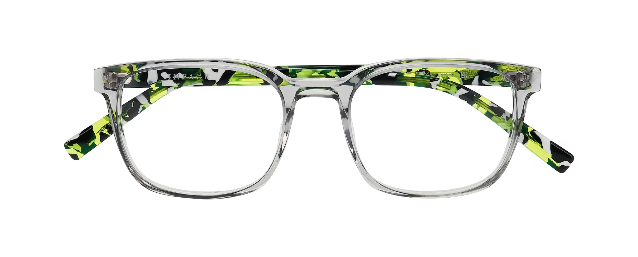 Choose from four striking colors, each featuring fun patterns and depth, from the transparent grey with wild green demi temples to the bold grey camo stripe.