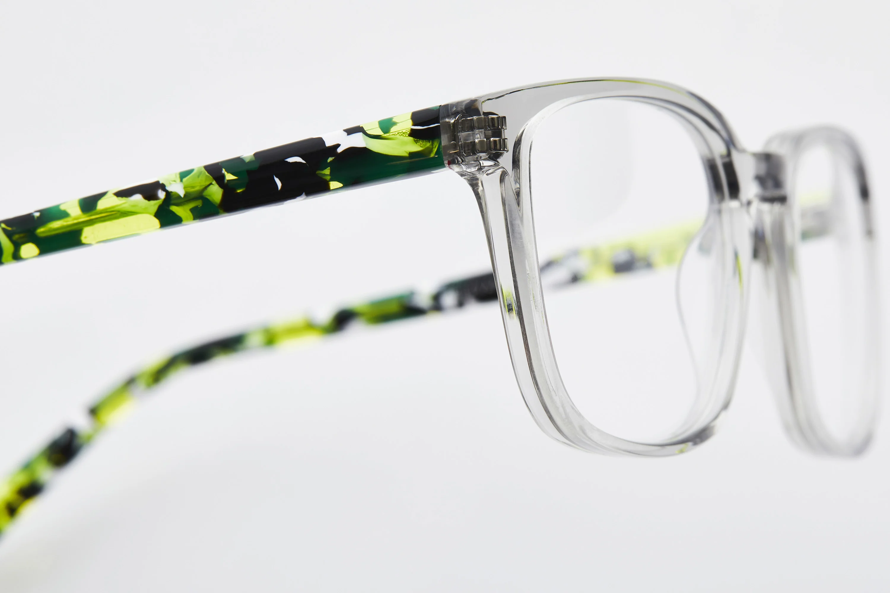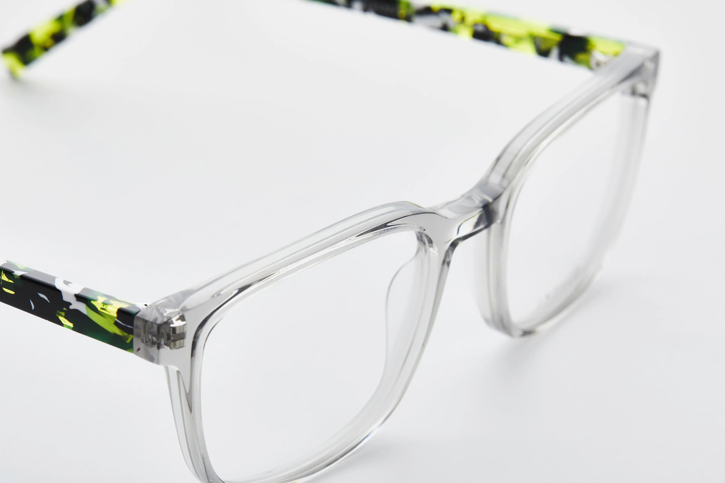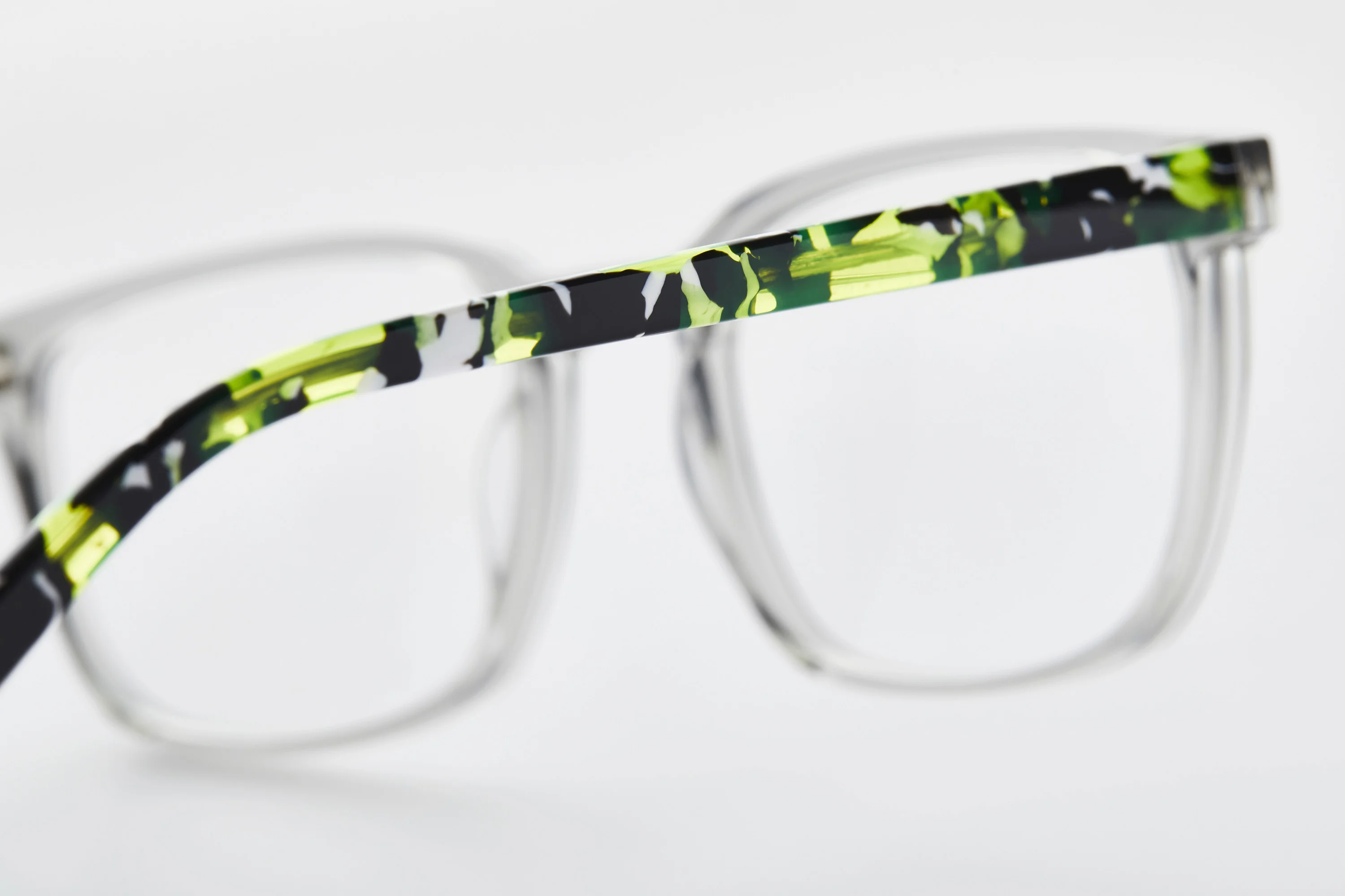 Choose from four striking colors, each featuring fun patterns and depth, from the transparent grey with wild green demi temples to the bold grey camo stripe.